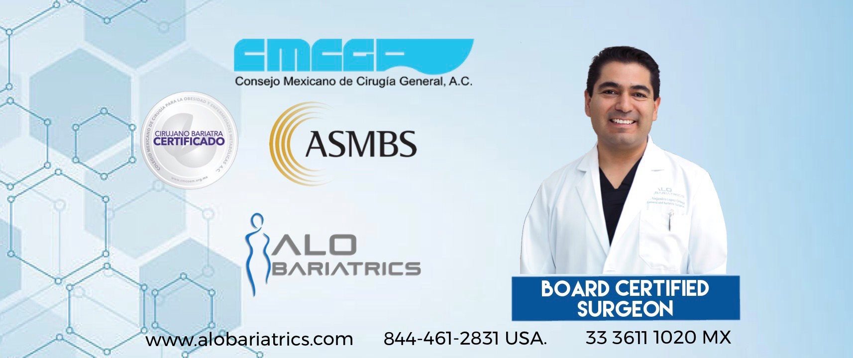 Sus certificaciones incluyen pertenecer a organizaciones internacionales de alto prestigio como la American Society for Metabolic and Bariatric Surgery (ASMBS), la International Federation for the Surgery of Obesity and Metabolic Disorders (IFSO), el Colegio Mexicano de Cirugía para la Obesidad y Enfermedades Metabólicas (CMCOEM) y ser Fellow del American College of Surgeons (FACS).
